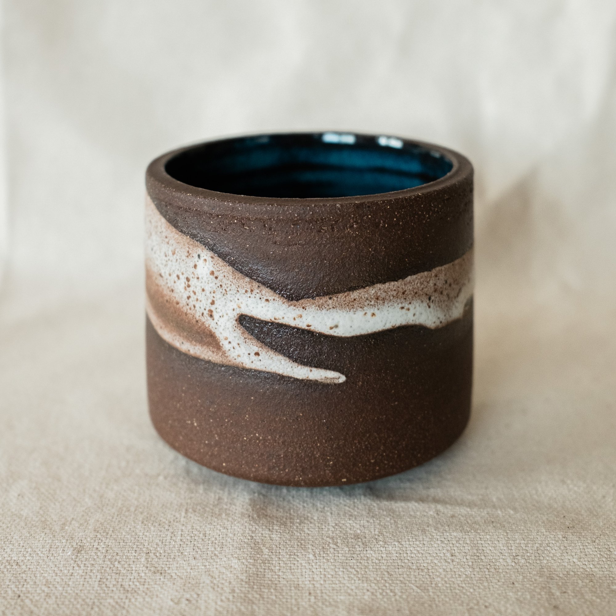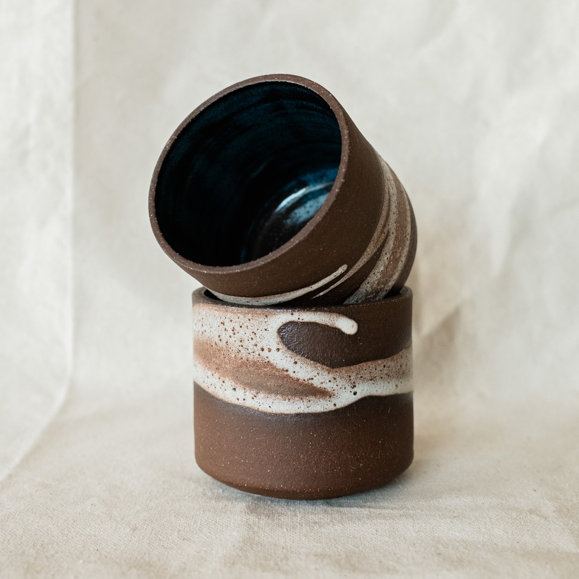 6oz Espresso Cups made from rich brown stoneware, painted with a strip of pebble white glaze and a deep blue interior gloss glaze.