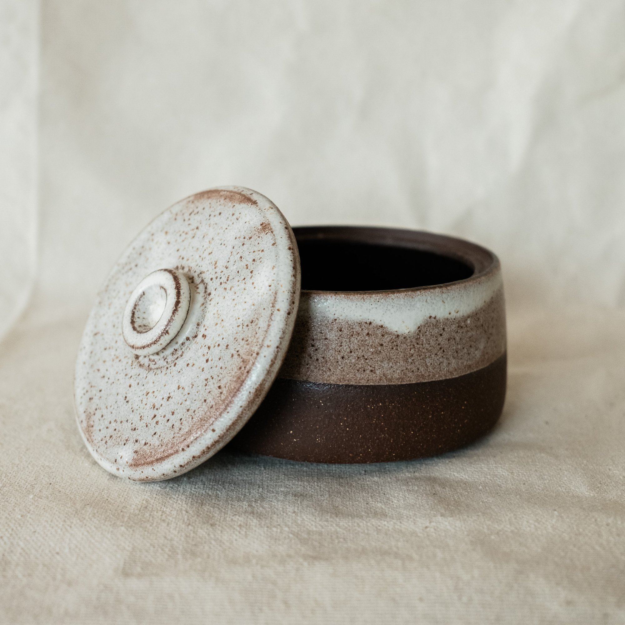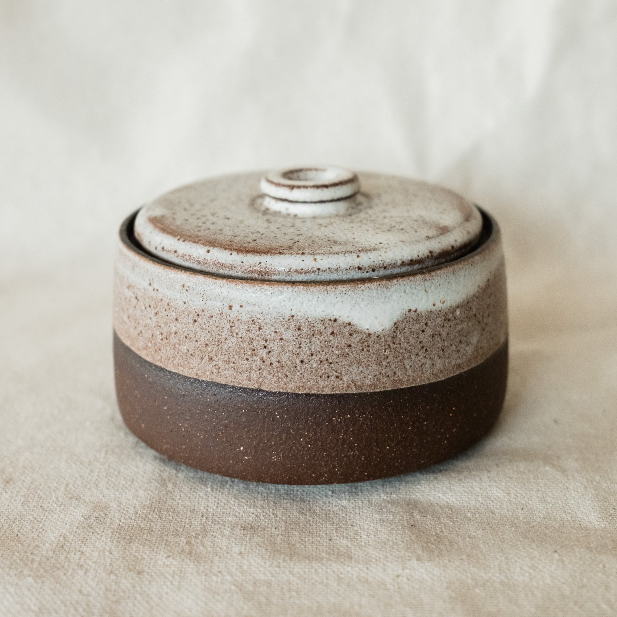 A small jar made from rich brown clay half dipped in a pebble white matte glaze and a blue glossy interior. Can be used for small objects or spices.
