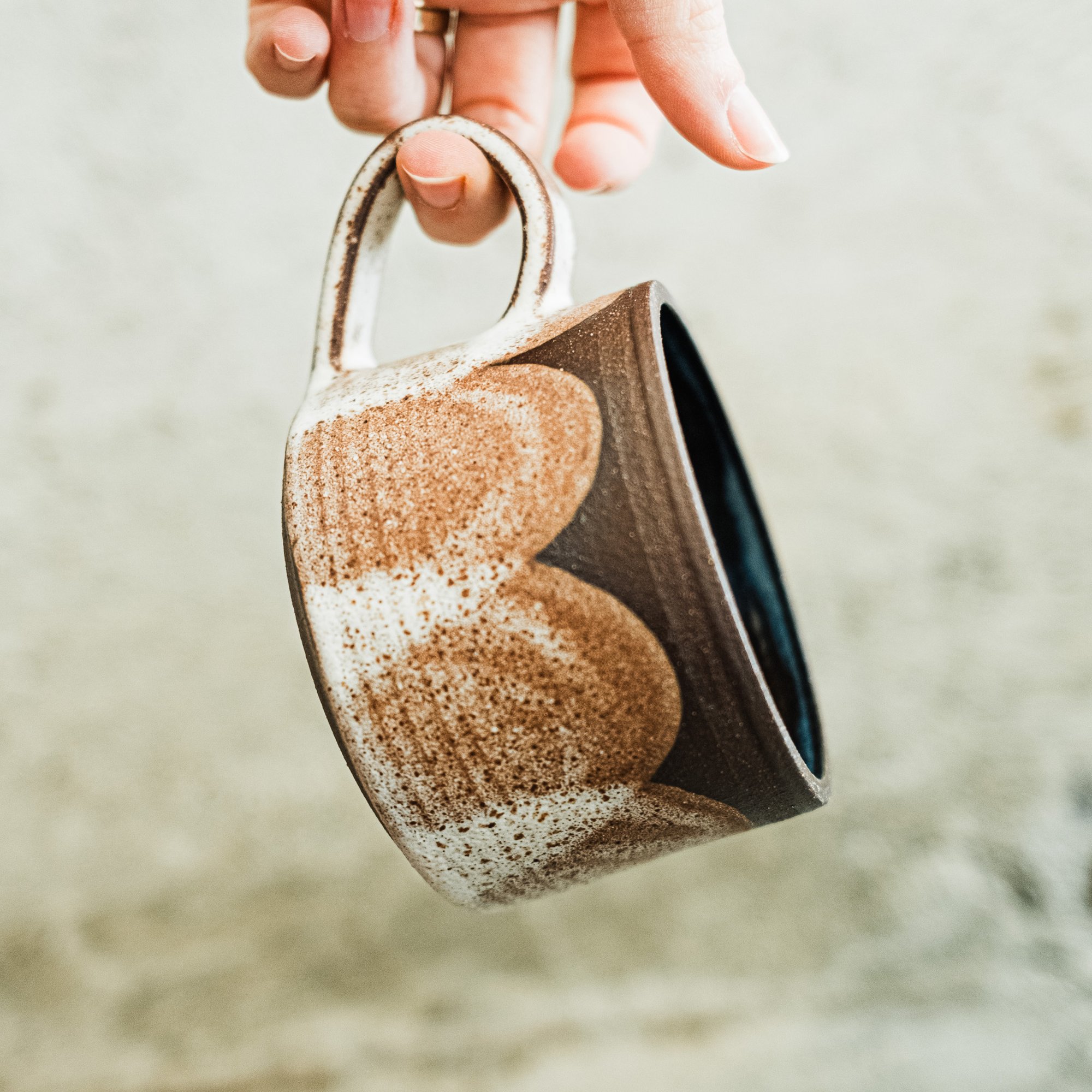 Short 10oz mug. Made with a rich brown clay and glazed decoratively with white. The interior of the mug is a variegated blue. Note that the lip of this mug is a raw clay texture.