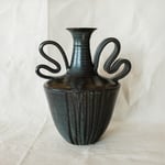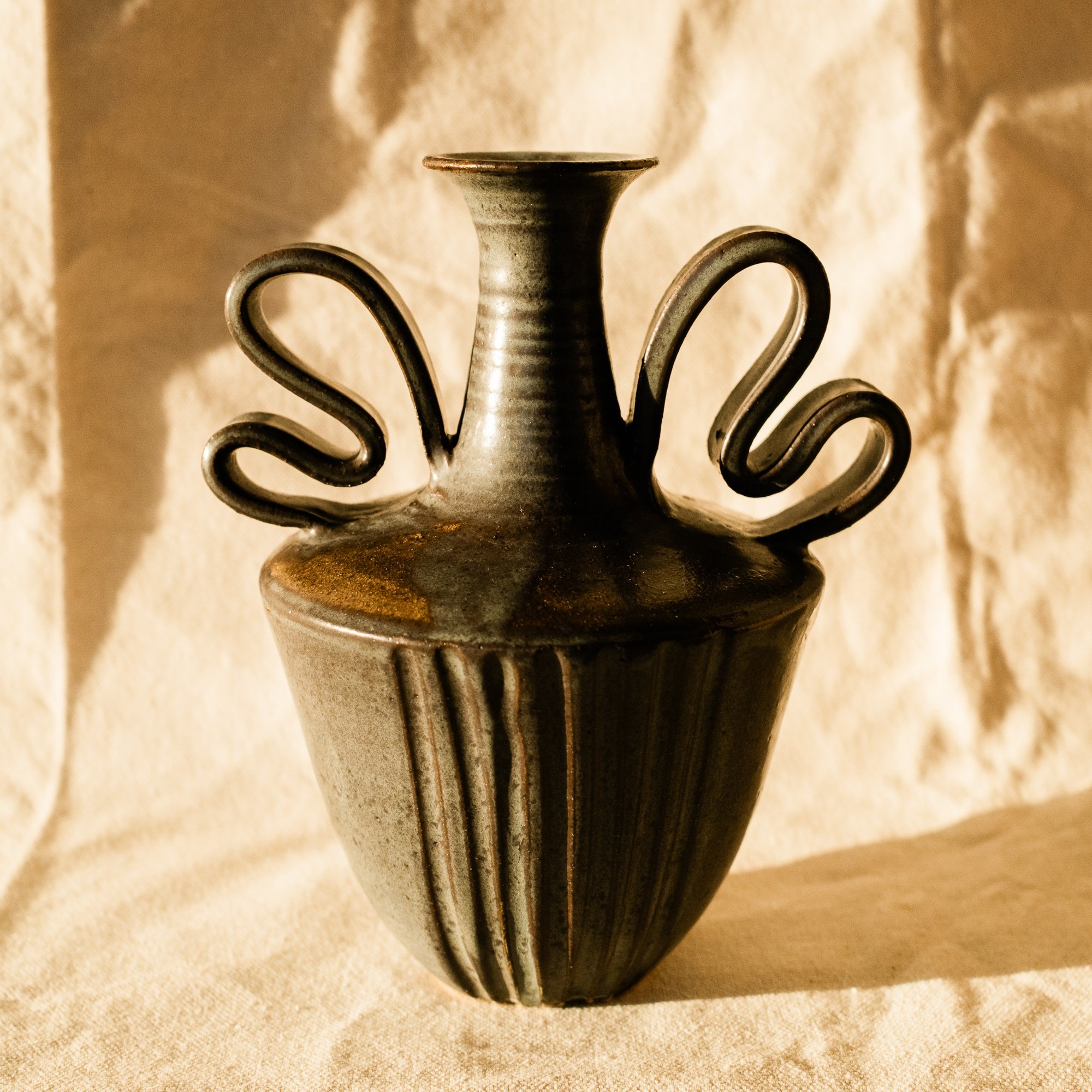 A double handled amphora vase made from speckled stoneware in a black glaze that breaks into a silvery blue where thicker. Hand-carved fluting details on the front and back.