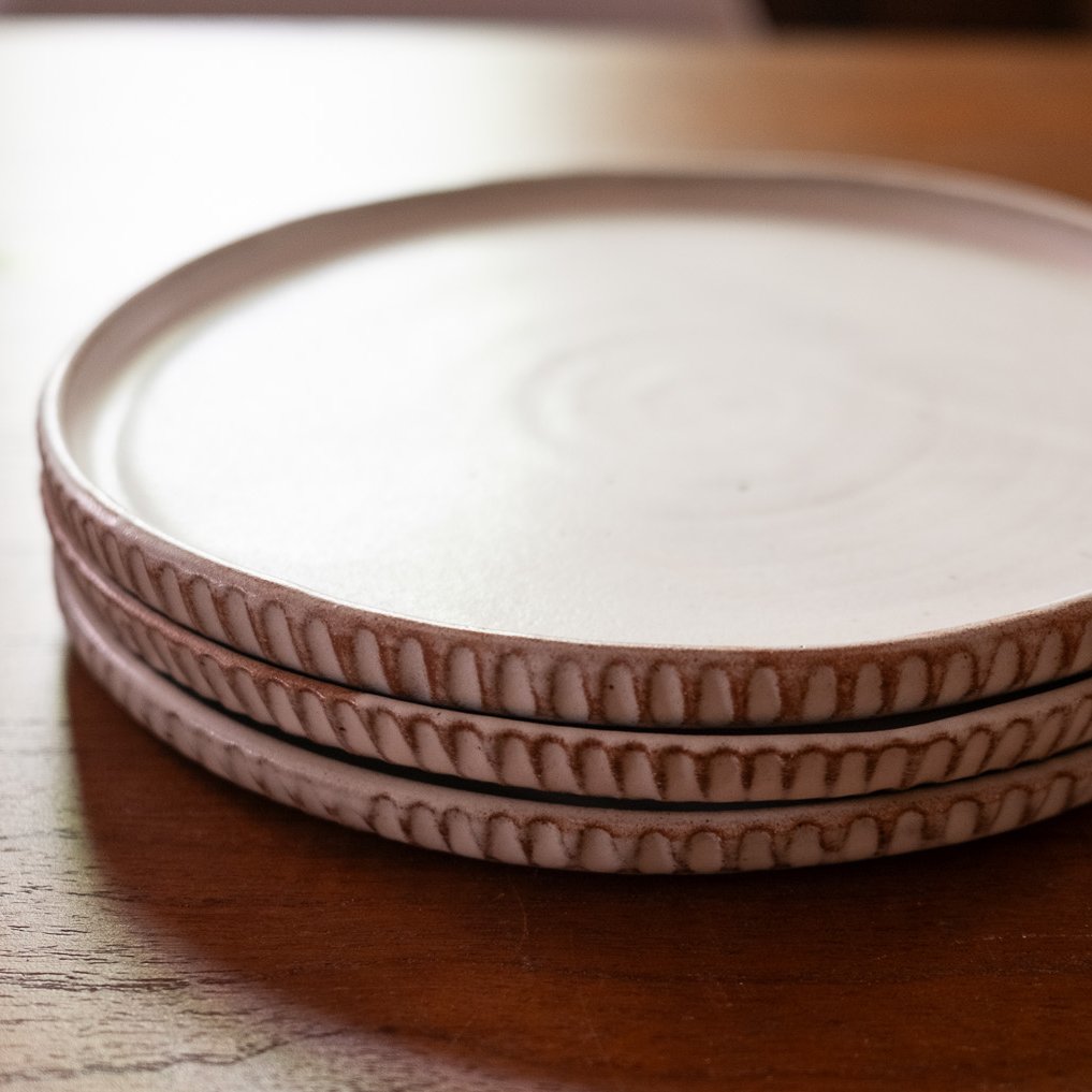 Plates made from a sandy stoneware with hand-carved rims in a pebble white matte glaze. There is variation in the glaze where thinner and thicker, as well as the occasional speck form the iron in the clay. These are great every-day plates and are dishwasher safe. They vary slightly in size but roughly measure a little over 8"