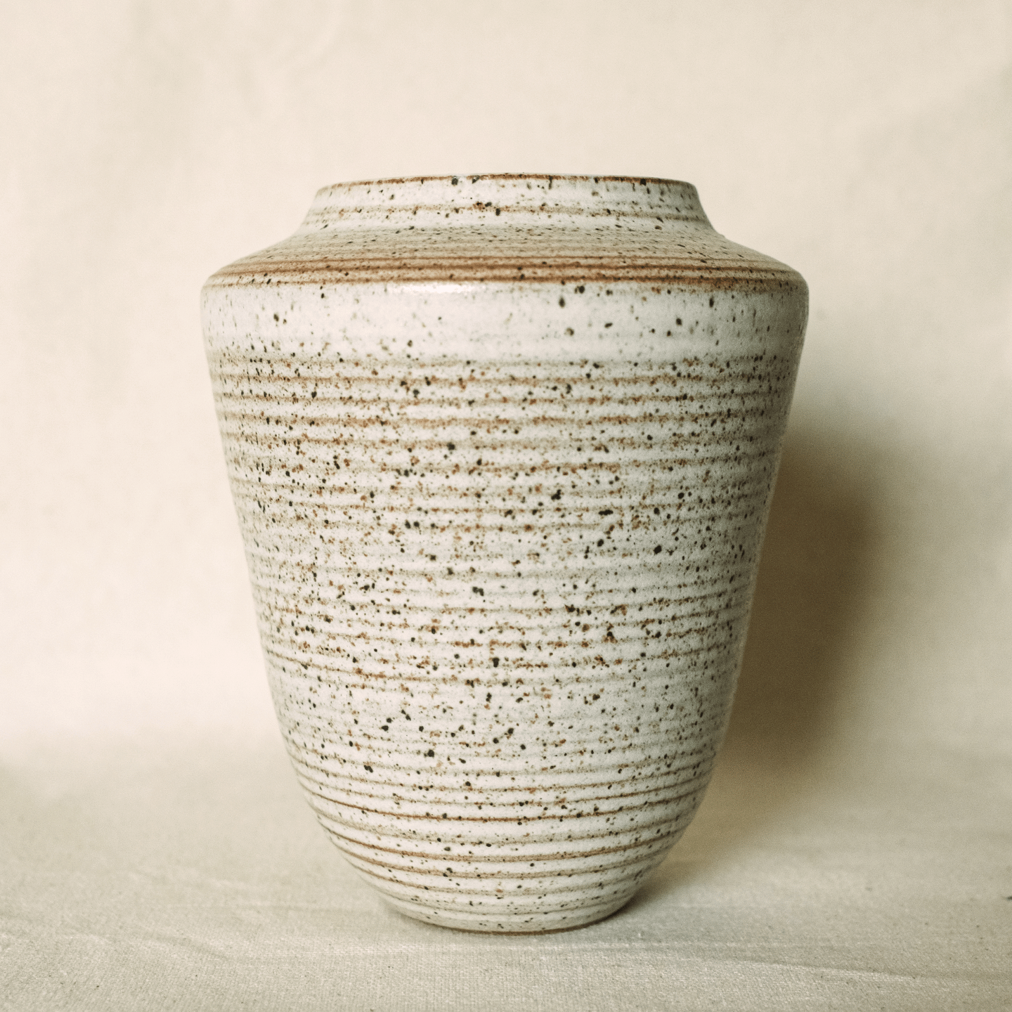 Large vase roughly 6.5” tall with ridged texture. Speckled stoneware dipped in a Pebble White matte glaze.