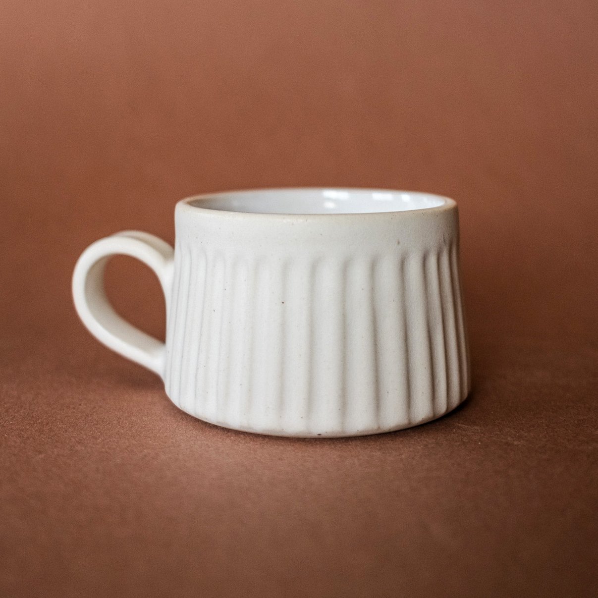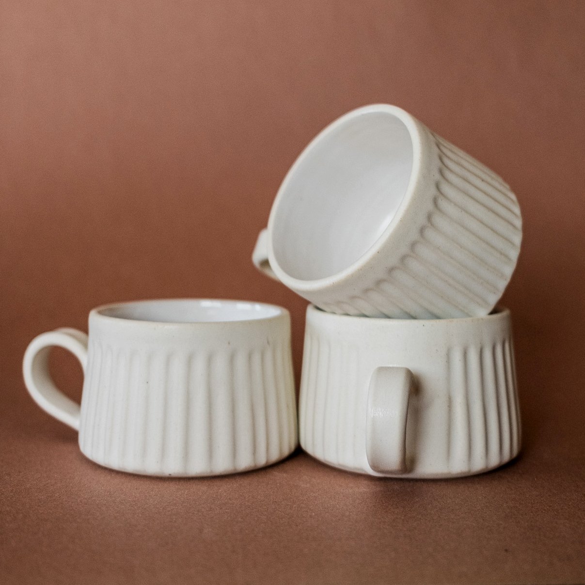 Hand-carved, porcelain 8oz mugs in stoney matte white glaze, and a glossy white interior. This is my personal favorite mug to drink out of.