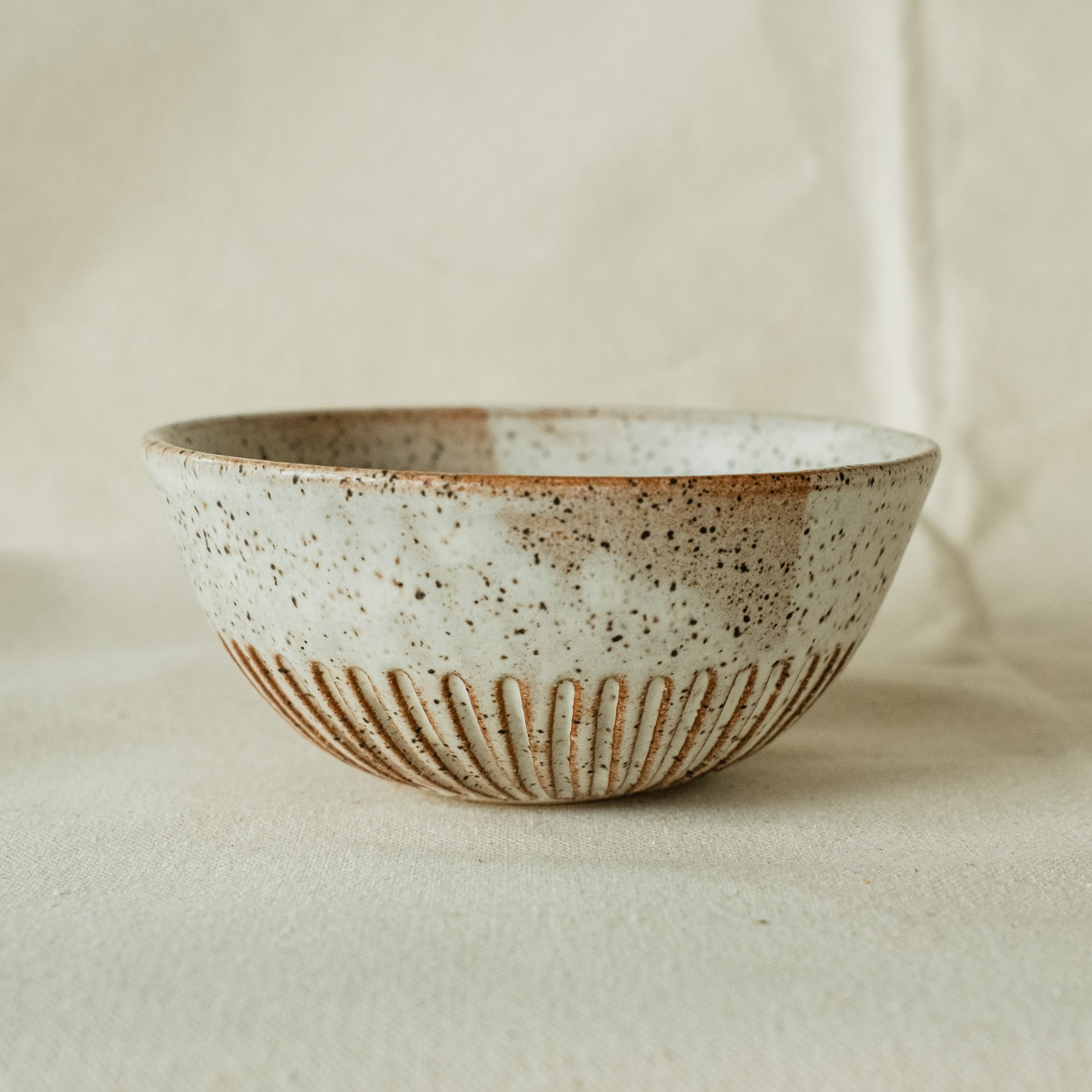 A small hand-carved bowl perfect for a couple scoops of ice cream, or your morning yogurt. Speckled stoneware with a pebble white glaze.