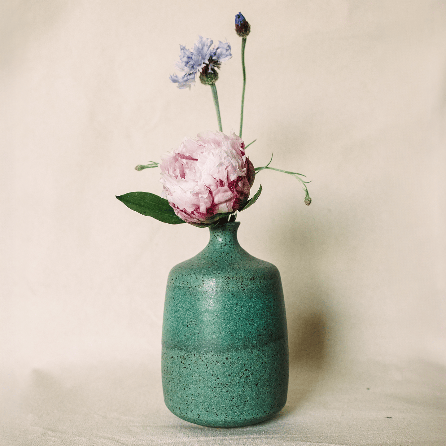 Small bud vase roughly 5” tall by 3.” wide. Speckled stoneware dipped in a Moss matte glaze.