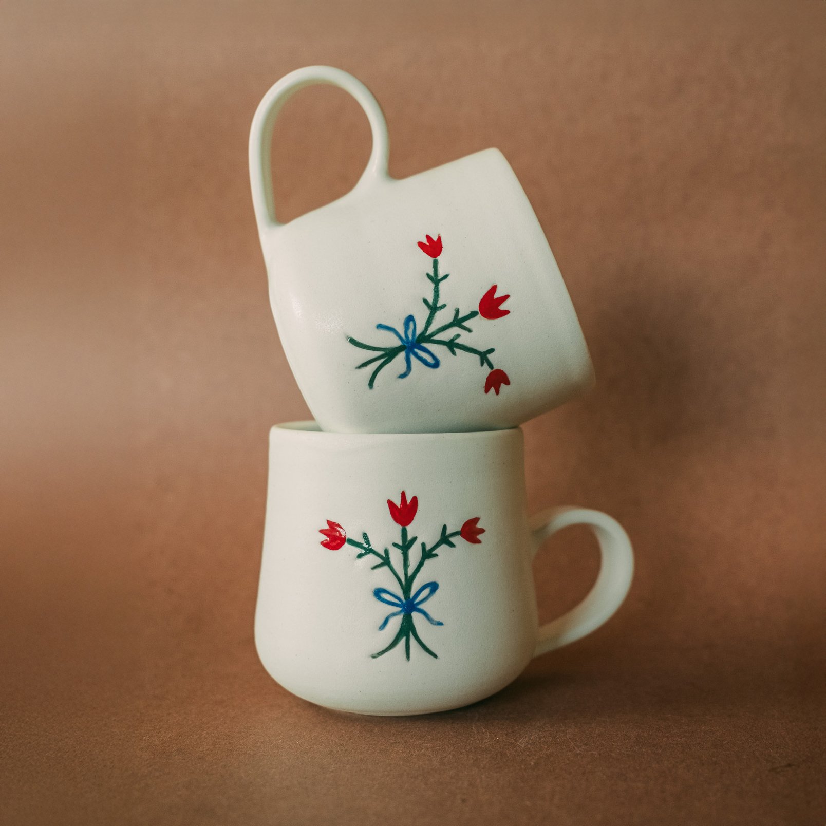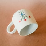 A porcelain mug with hand-painted tulip bouquet detail on both sides. Inspired by Scandinavian folk art. The mug is glazed in a bone white matte outer glaze and a white glossy interior for ease of cleaning. Only 2 available!