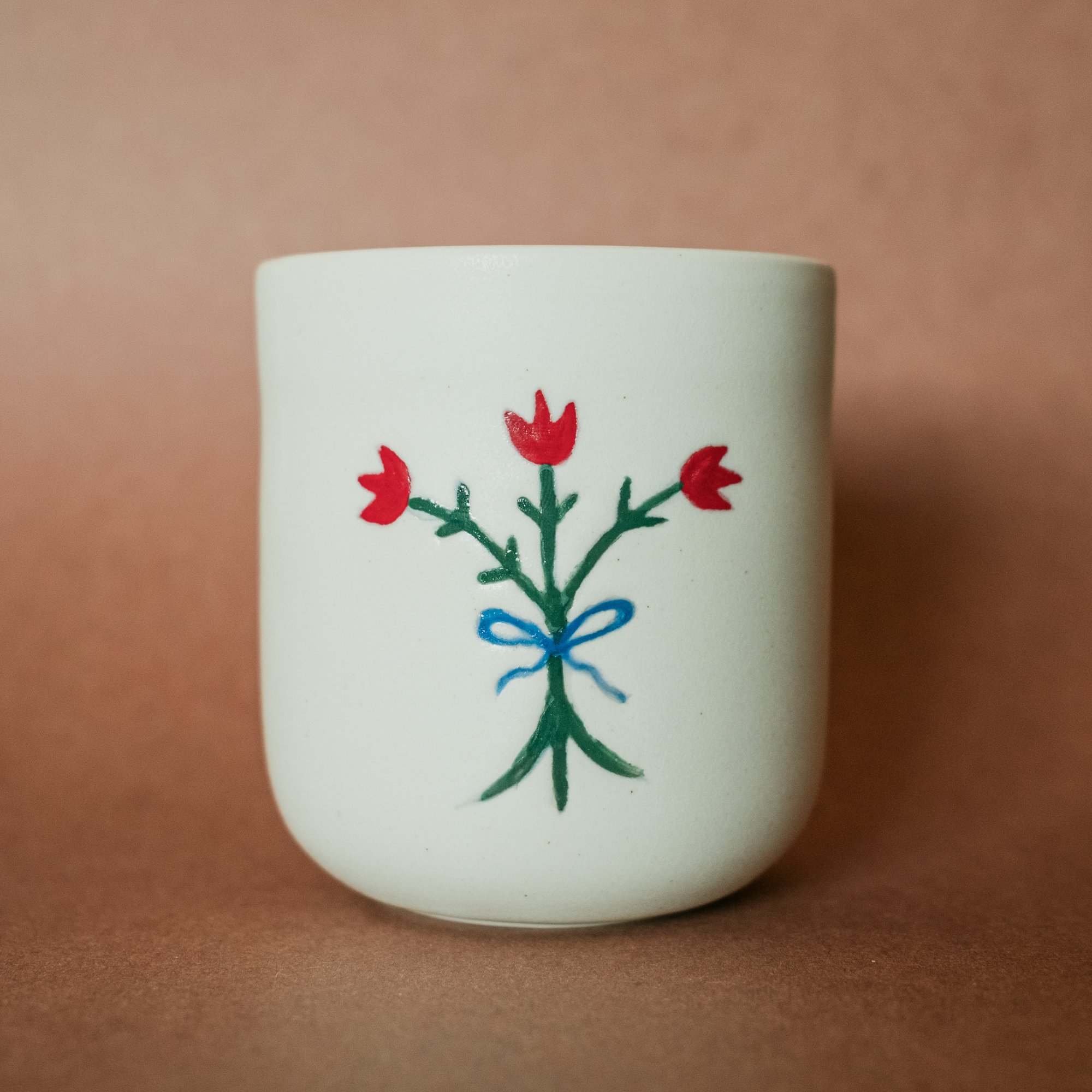 Porcelain tumbler with hand-painted Tulip bouquet detail on one side, inspired by Scandinavian folk art. The mug is glazed in a bone white matte outer glaze and a white glossy interior for ease of cleaning. Only 2 available!